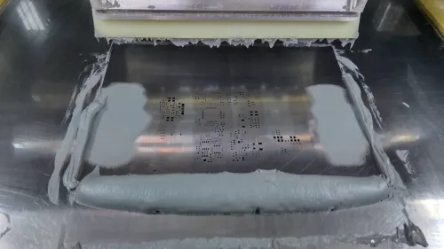 メタルマスクを使ったはんだ塗布方法は版画と同じ要領で、プリント基板の上に穴のあいたメタルマスクを置き、その上にはんだを流し込めば、部品を接着する場所である穴の開いた部分にのみ、はんだが残ります。