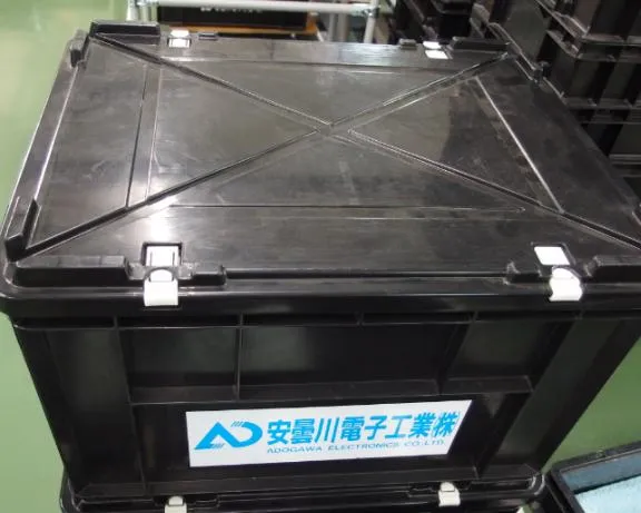 写真の黒い箱は、安曇川電子工業(基板実装・OEM受託センター.com)専用の通い箱(通函)です。