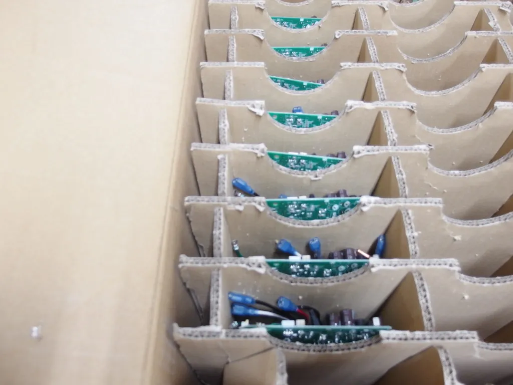 プリント基板を衝撃や静電気から守るため、特殊な緩衝材で梱包します。
