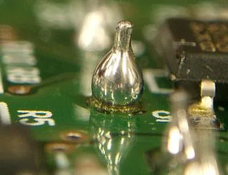 飛び散ったはんだが冷えて固まった場合に発生します。ほとんどの場合は、基板を傾けると、また軽く触れるだけで転がり落ちます。