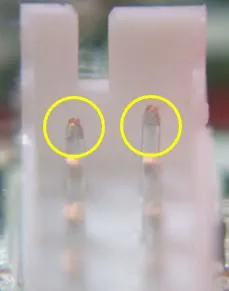 (写真)左右とも導通があるが、右側は疑似接触状態となっている。