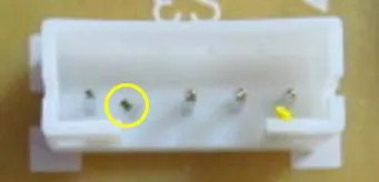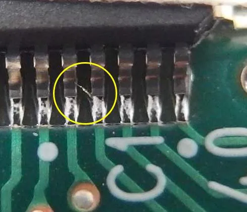 写真のコネクタは、ピンに熱を加えすぎたせいでピンが移動したり傾いたりしています。